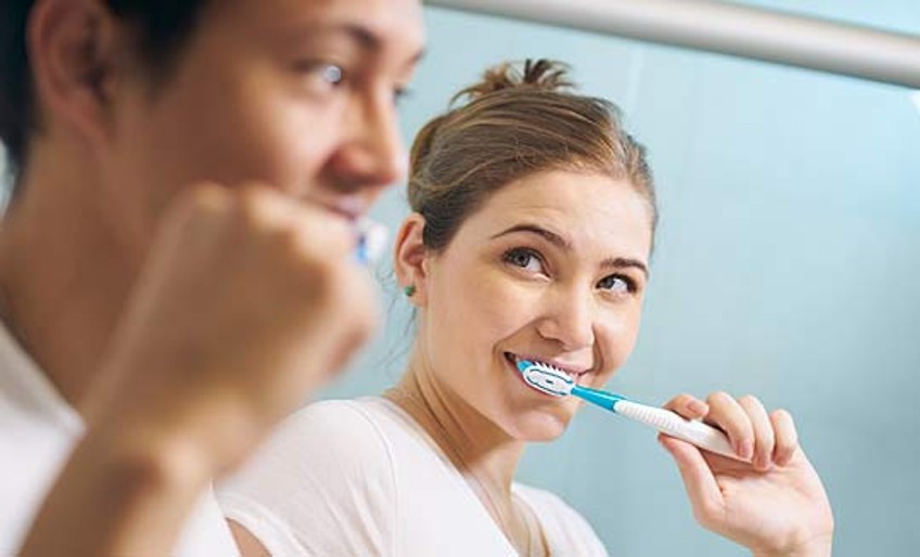 Frau wird vom Zahnarzt mit Spiegel untersucht