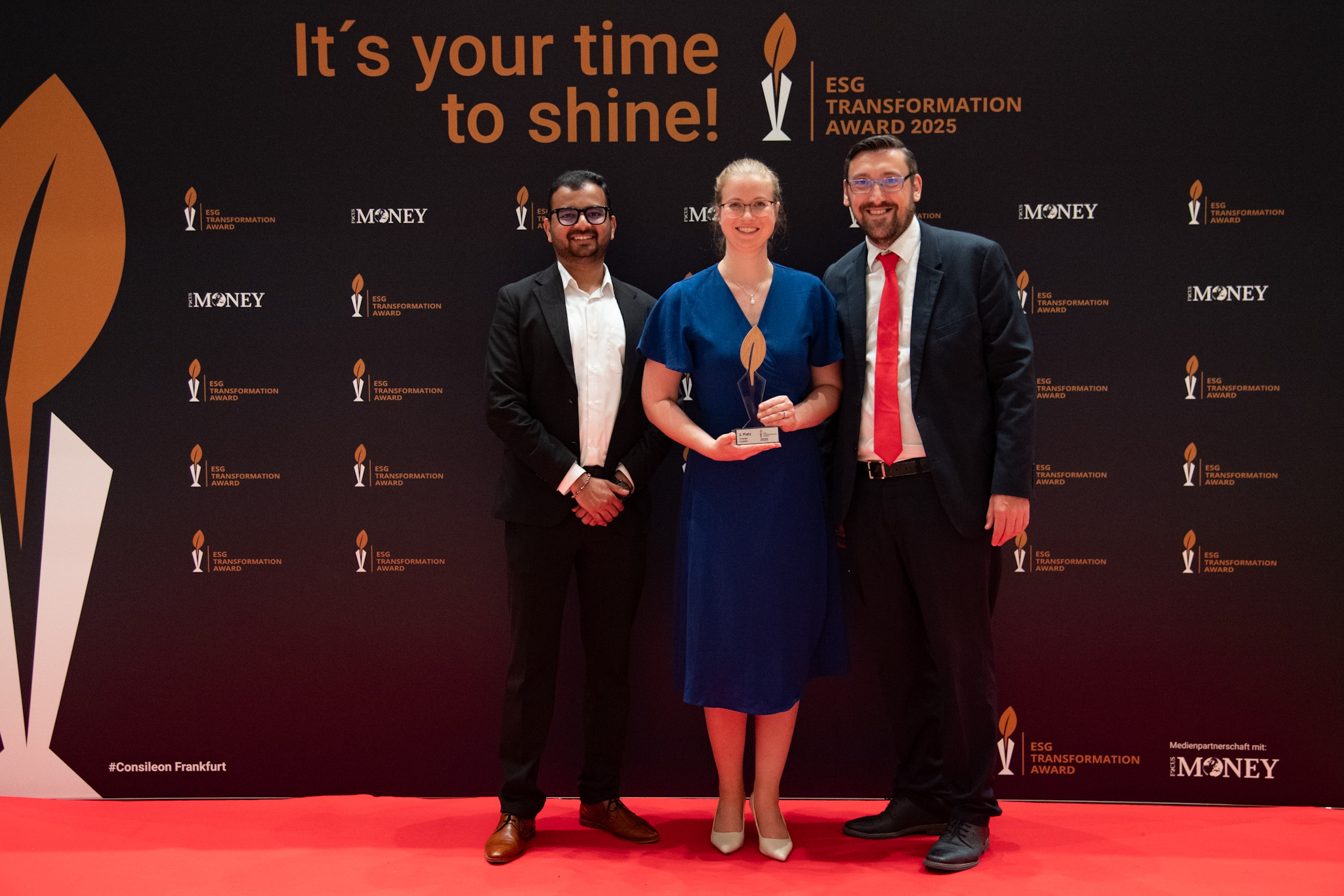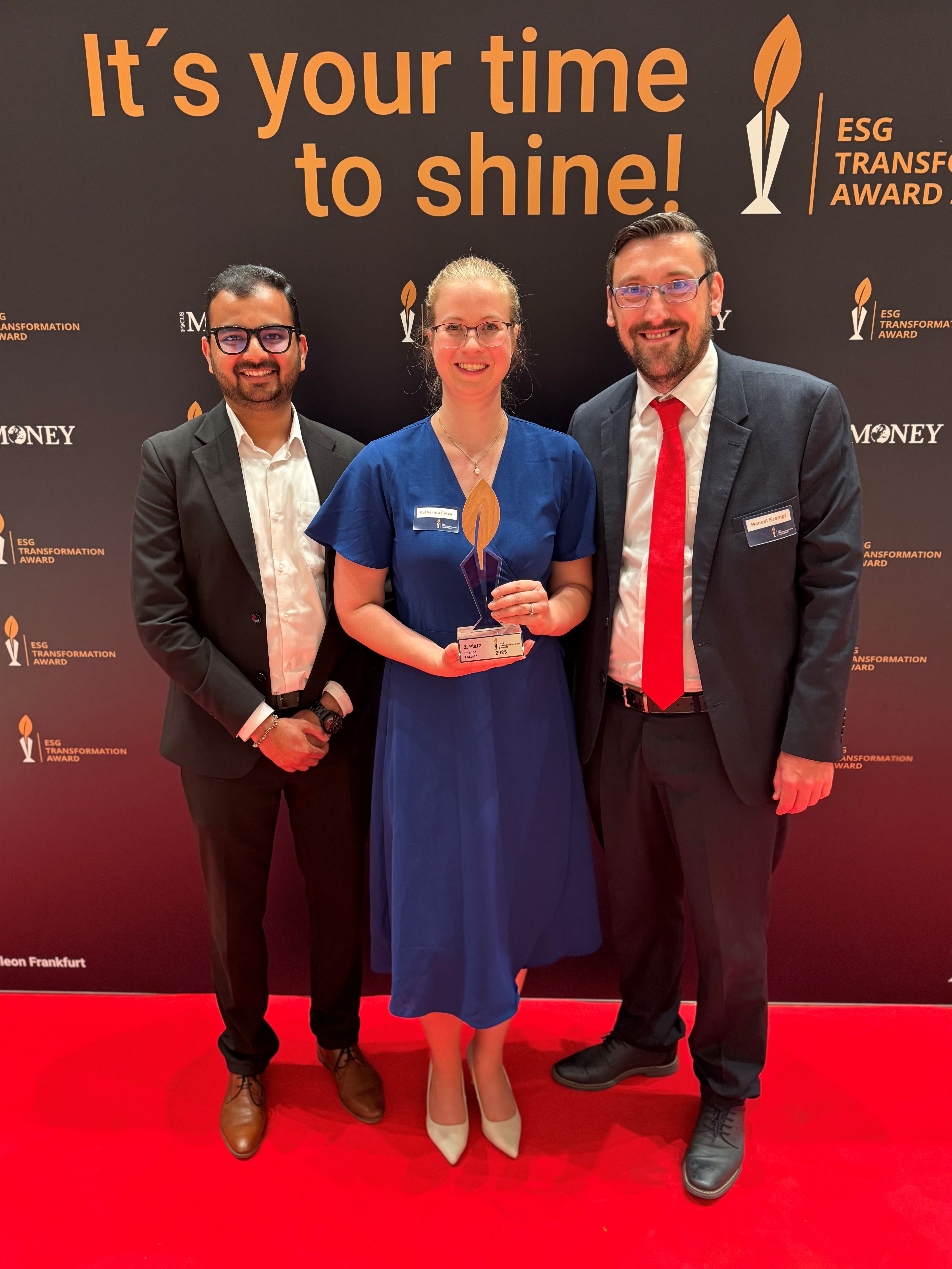 DEVK-Tochter hylane erhält den „Nachhaltigkeits-Oscar“ in der Finanzwirtschaft, den ESG Transformation Award. Das Gewinner-Team (von links): Kashyap Tank (Expert Fuel Cell, hylane), Katharina Fetzer (Head of IT, hylane), Manuel Krempf (Beauftragter für Nachhaltigkeit, DEVK).