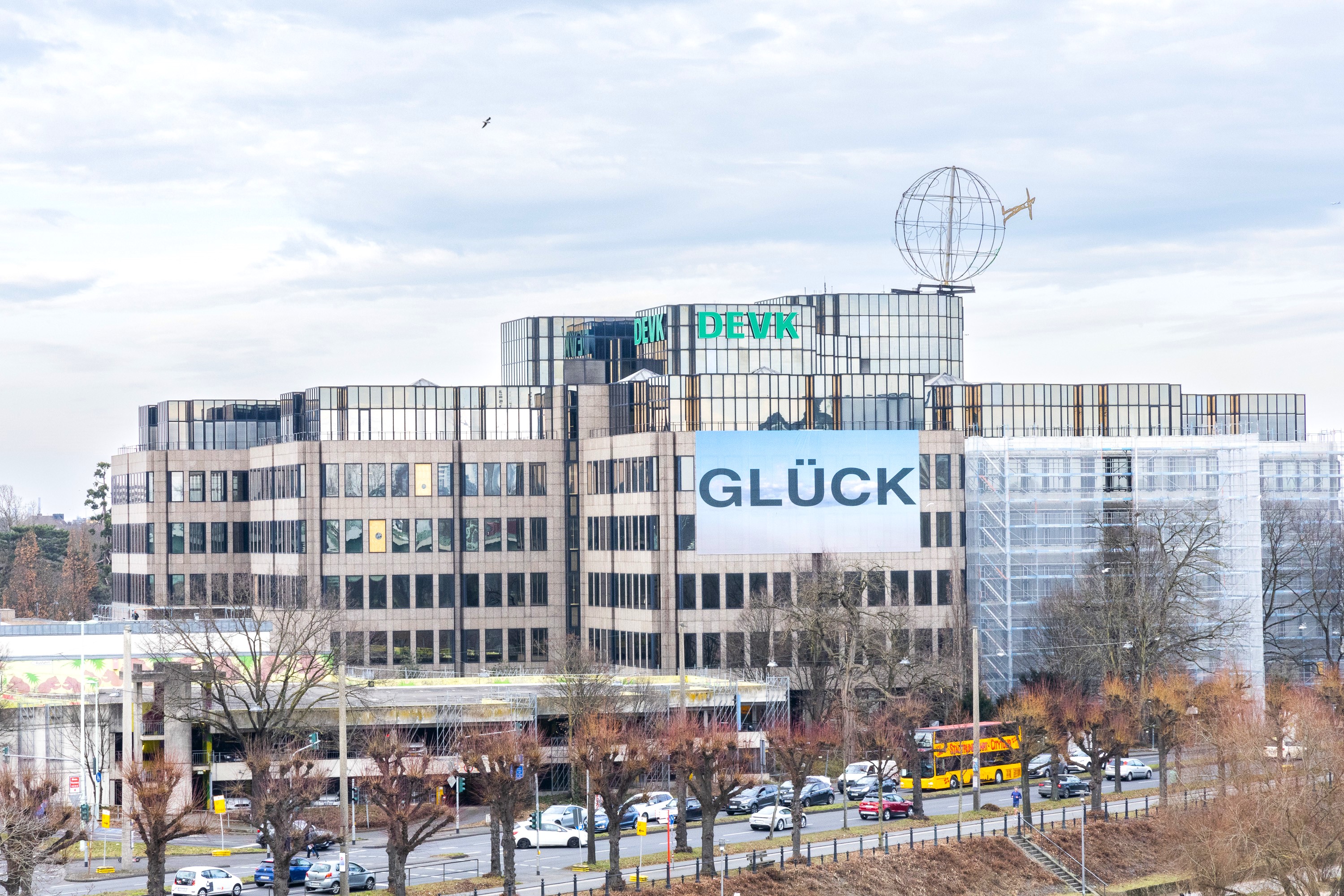 Im Rahmen der Sanierungsarbeiten an der DEVK Zentrale in Riehl ziehen auch die Kunstwerke von HA Schult vorübergehend um. Das Glücks-Banner an der Fassade wurde bereits abgenommen und wird in Kürze am Gerüst neu befestigt. Im Herbst hebt ein Kran die Weltkugel auf dem Dach ein Stück tiefer.