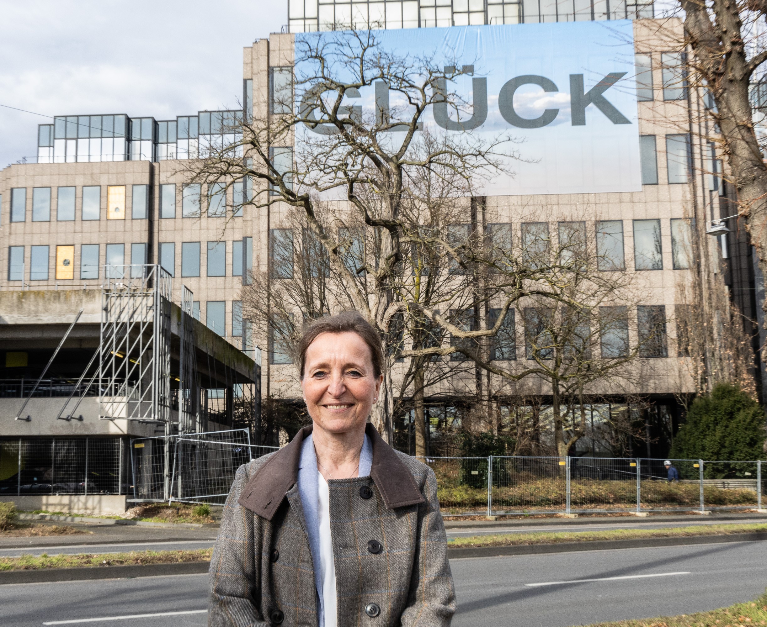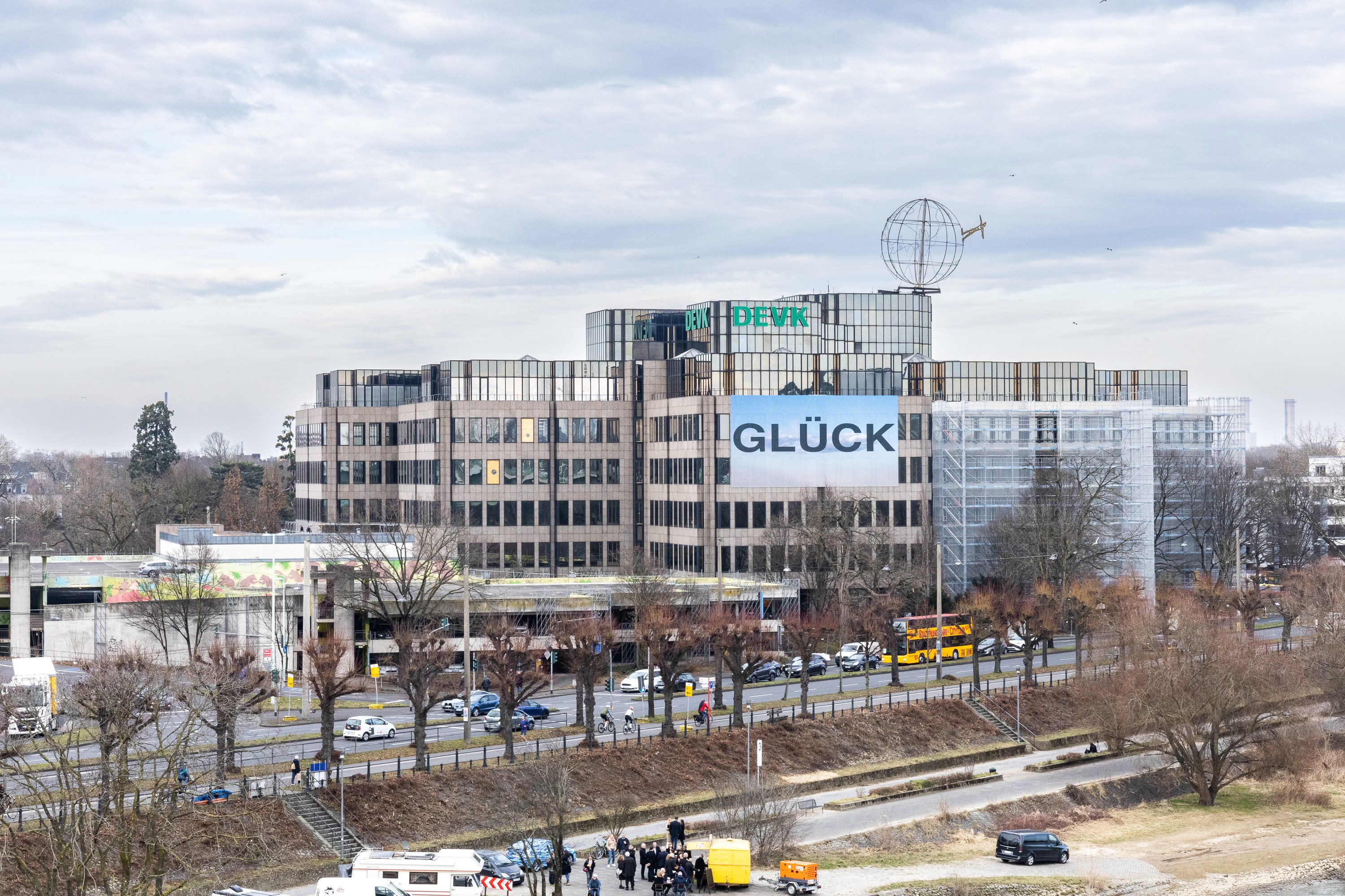 Wer von Köln-Mülheim über die Zoobrücke Richtung Innenstadt fährt, sieht auf der rechten Seite die DEVK Zentrale. Gerade im Dunkeln ist das Gebäude ein echter Hingucker, denn auf dem Dach leuchtet seit 25 Jahren die Weltkugel von HA Schult. Nun kommt für die Kölnerinnen und Kölner ein optisches Highlight dazu, das tagsüber ins Auge fällt. An der Fassade prangt in großen Lettern das Wort „GLÜCK“. Der Begriff ist der Titel einer aktuellen Kunstaktion, bei der HA Schult die Stadtgesellschaft zum Mitmachen auffordert. Alle können dabei sein – Große und Kleine, Alte und Junge, Urkölsche und Zugezogene.