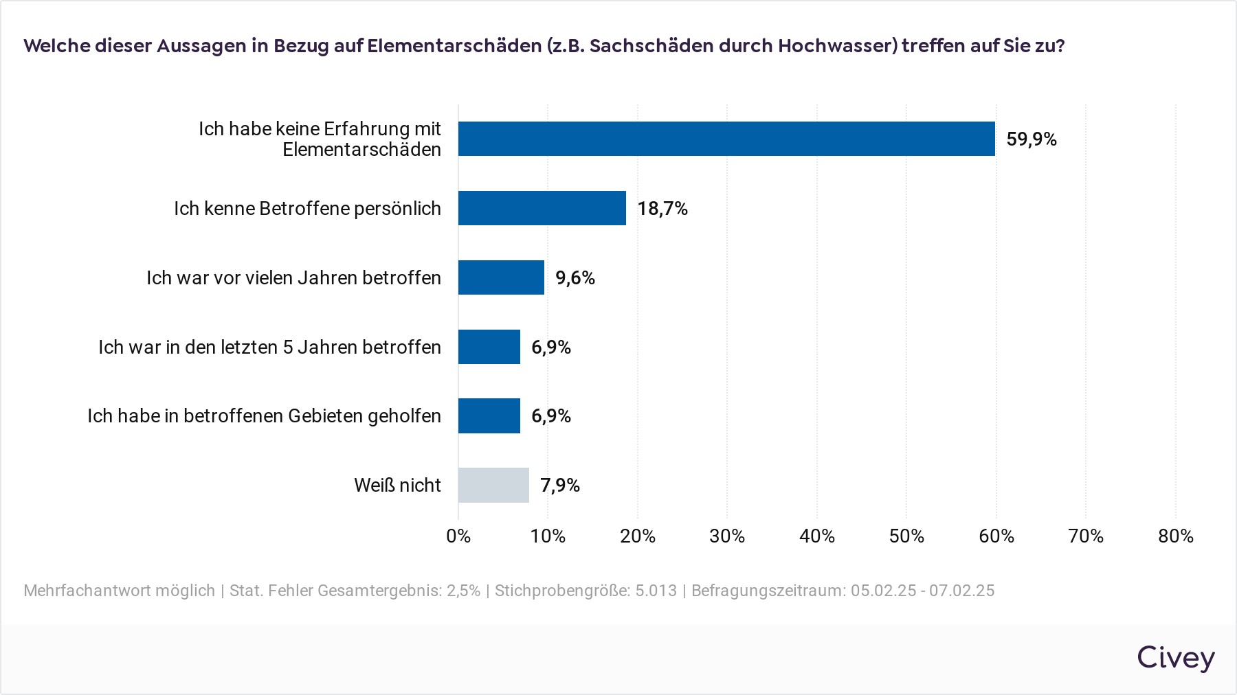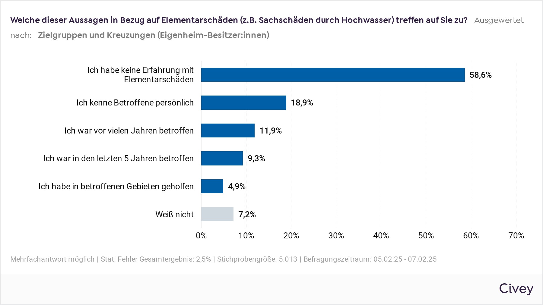 Dabei gehören 60 Prozent der Befragten zu den Glücklichen, die bisher keine Erfahrungen mit Elementarschäden gemacht haben. Dagegen waren rund 7 Prozent der Gesamtbevölkerung in den letzten 5 Jahren selbst betroffen, weitere 10 Prozent vor vielen Jahren. Bei den Menschen mit Wohneigentum sagen sogar 21 Prozent, dass sie in ihrem Leben bereits Erfahrungen mit Hochwasser & Co. machen mussten. Etliche kennen persönlich Betroffene oder haben bei Aufräumarbeiten mitgeholfen.