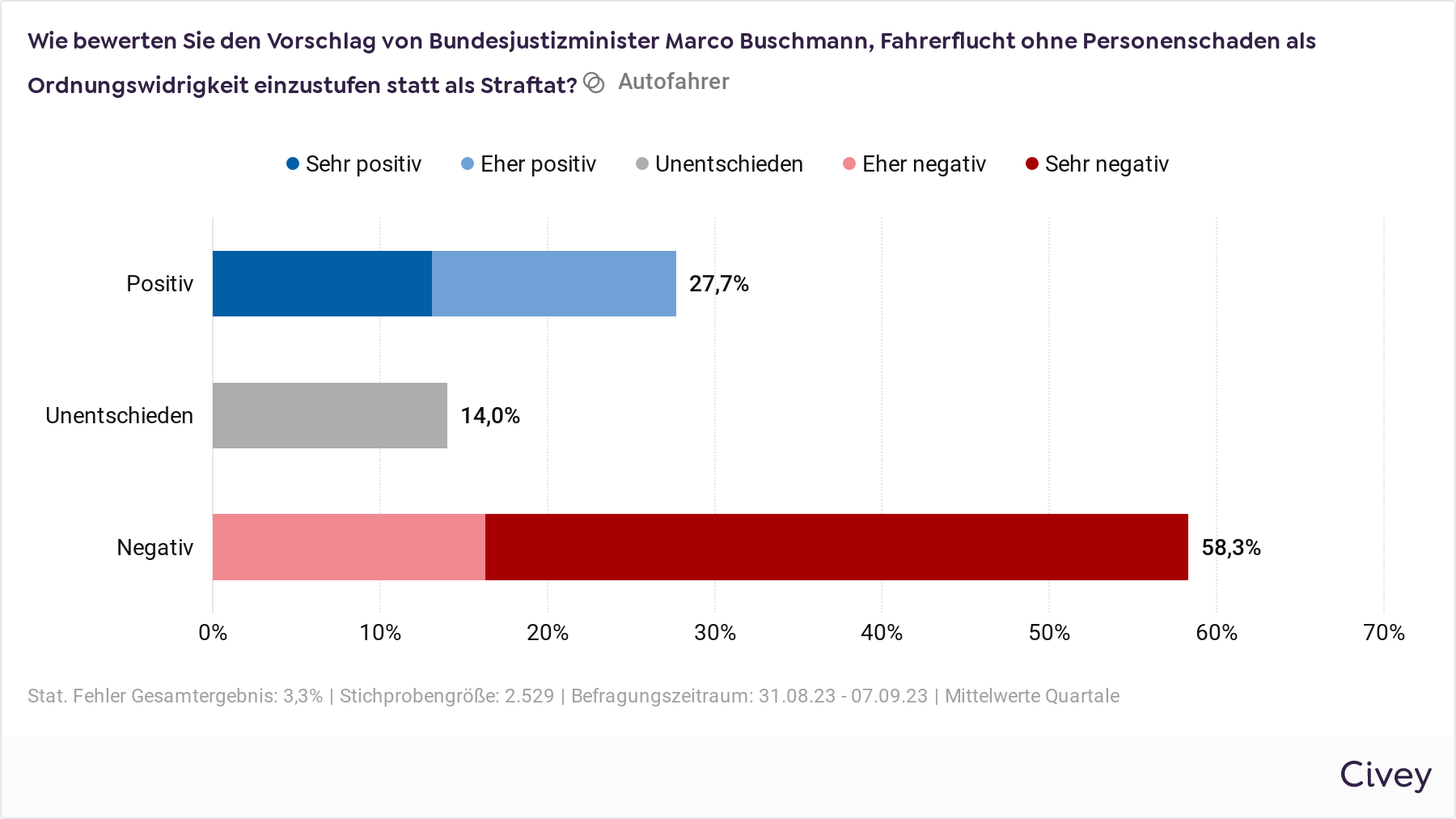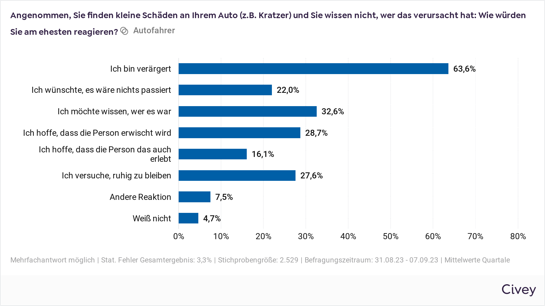 Das Meinungsforschungsunternehmen Civey hat vom 31.08. bis 08.09.2023 im Auftrag der DEVK 2.500 Autofahrerinnen und Autofahrer online repräsentativ befragt. Der statistische Fehler der Gesamtergebnisse liegt bei 3,3 %.