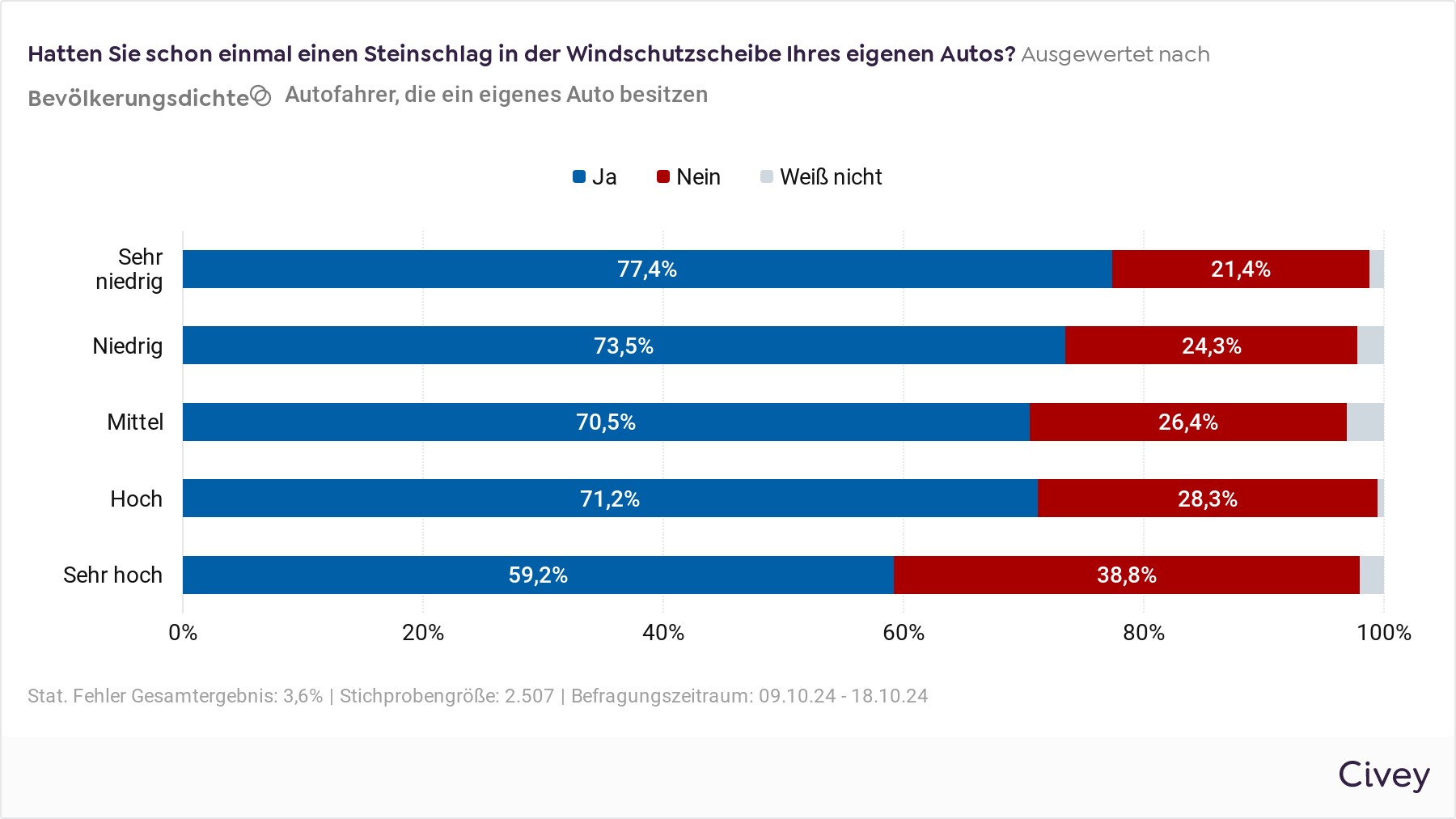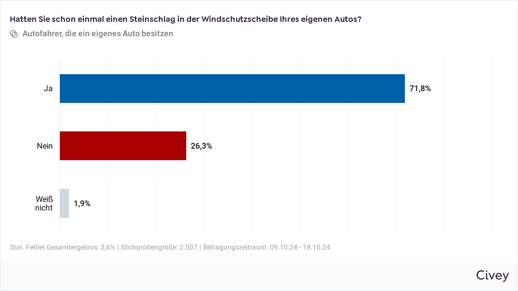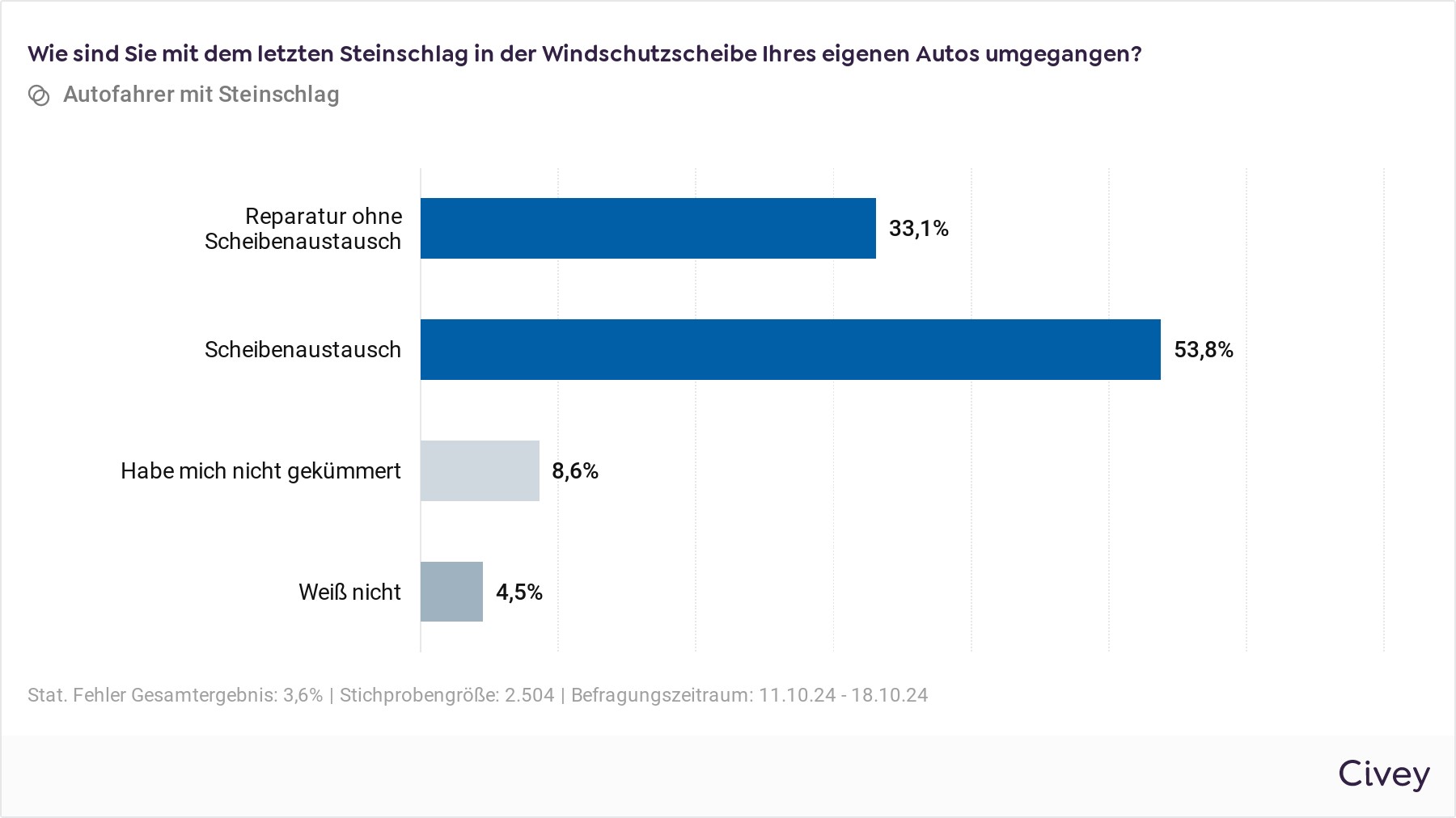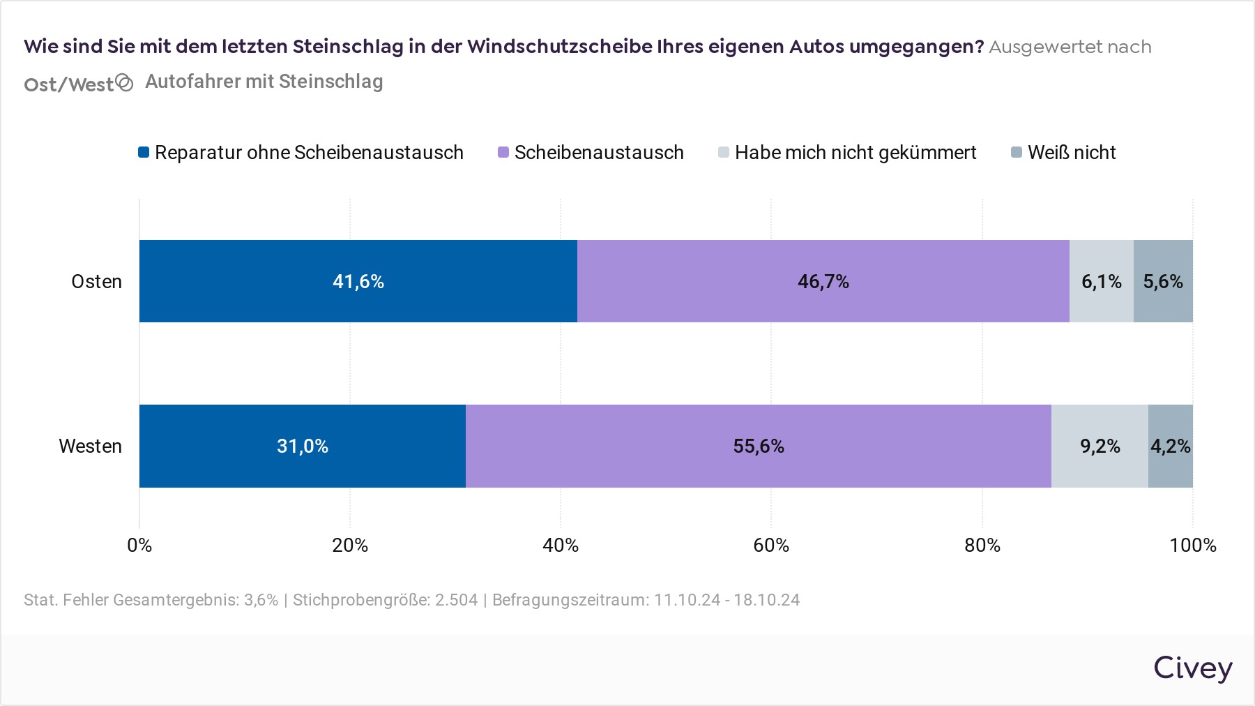 Wie der regelmäßige Reifenwechsel, so treiben auch lästige Steinschläge in der Windschutzscheibe Autofahrerinnen und Autofahrer in die Werkstätten. Fast 72 Prozent der Menschen mit eigenem Pkw hatten schon einmal einen solchen Schaden – vor allem in dünner besiedelten Gebieten. Vielleicht, weil es dort mehr landwirtschaftlichen Verkehr gibt. Wenn der Steinschlag nicht größer ist als ein 2-Euro-Stück, noch keinen Riss gebildet hat und vom Steuer aus gesehen nicht im Sichtfeld liegt, dann ist eine Reparatur mit Spezialharz möglich. Dennoch haben fast 54 Prozent der Befragten beim letzten Steinschlag ihre Scheibe austauschen lassen. Für die Reparatur haben sich im Schnitt nur rund 33 Prozent entschieden. Interessant: In den ostdeutschen Bundesländern (rund 42 Prozent) ist das Reparieren deutlich beliebter als in den westdeutschen (31 Prozent).